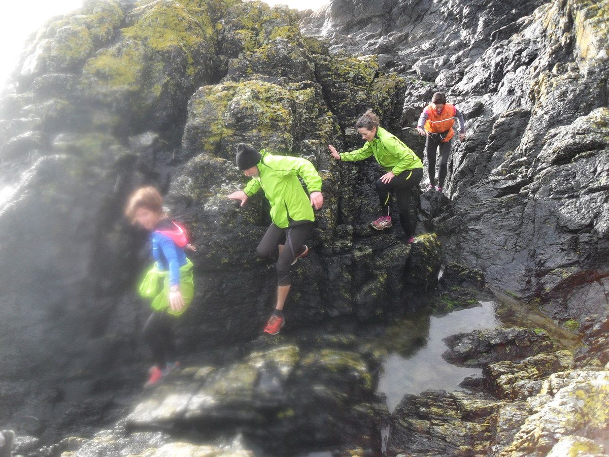 Après une bonne vingtaine de minutes de varappe sur les rochers, seuls les 3 ou 4 premiers avaient réussi à passer l'obstacle. La mer montant à vitesse grand V, les suivants ont dû se résoudre à faire demi-tour. Et rebelote dans l'autre sens, la flotte en plus !!